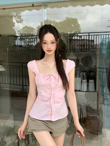 设计感短袖衬衫女夏季2025新款巨好看的小衫法式上衣粉色气质衬衣
