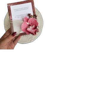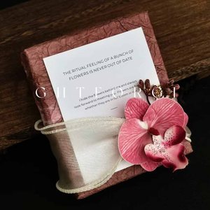 牛皮纸空抽屉盒+棕色包装纸+白色鱼尾丝带+红蝴蝶兰+装饰植物+随机卡片+点胶+双面胶一个约10.6x