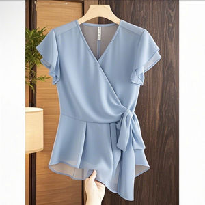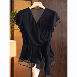 フレンチ V ネックフリル細いストラップウエストシャツ女性のための夏の新しいデザイン小さなフライングスリーブトップシフォンシャツ