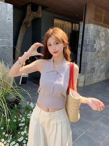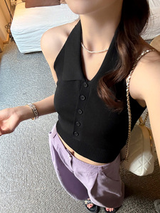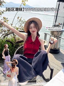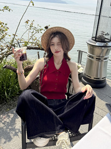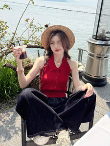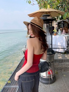 女性用の赤いニットホルターネックキャミソール、2025年の新しい夏のスタイル、美しいバックトップ