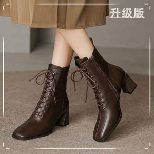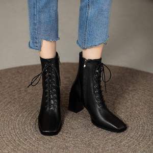 ショートブーツ レディース ハイヒールブーツ 太ヒール フレンチレトロマーティンブーツ 気質スリムブーツ レースアップ ソフトレザー スクエアトゥ チェルシーブーツ