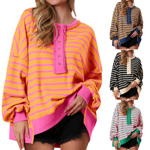 Amazonクロスボーダー秋冬新作ヨーロッパとアメリカのカラーブロックルーズカジュアルセーター長袖ストライプトップ女性用