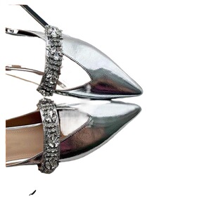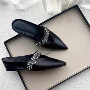 レザーバージョン~Zhao Lusiと同じスタイルの女性用ラインストーンつま先スリッパ、レトロな夏の平底ポインテッドトゥハーフスリッパ