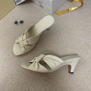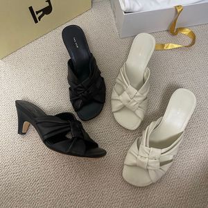 オリジナルの単一チャネル商品です!広東省産シープスキンスクエアトゥプリーツツイストハイヒールスリッパカジュアルビーチサンダル