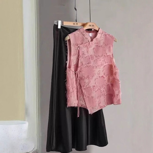 ヨーロッパ春と夏のルーズ小柄な新しい中国風ピンクノースリーブシャツ女性のベストベストトップ