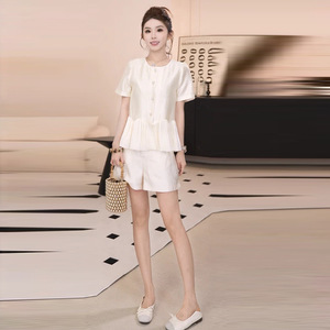 Xiaoxiangfeng ファッションスーツ女性のための 2025 夏の新しいスタイルスリムスプライシング半袖トップワイドレッグパンツ 2 点セット