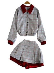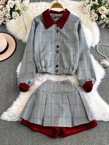 学院风美式复古格纹外套女冬季小个子休闲套装裤百褶半身裙两件套