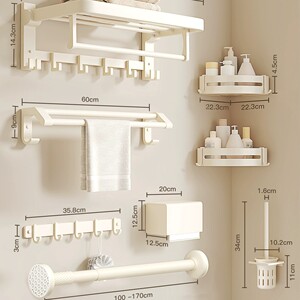 【7点セット】タオル掛け+タオルバー+三脚*2+ティッシュボックス+トイレブラシ+ローフック+乳白伸縮ポール100-170