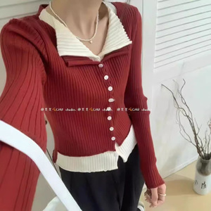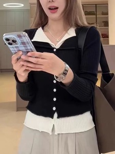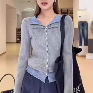 2025秋冬新款修身韩系针织开衫假两件时尚气质优质毛衣女短款上衣