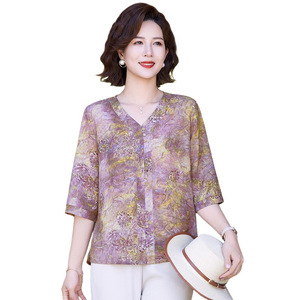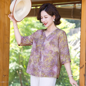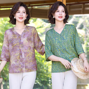 时尚妈妈装夏季新款v领短袖衬衫洋气中老年人薄款印花T恤上衣服女