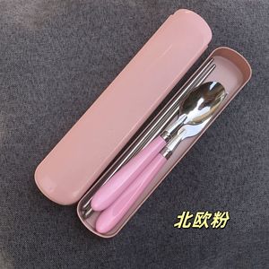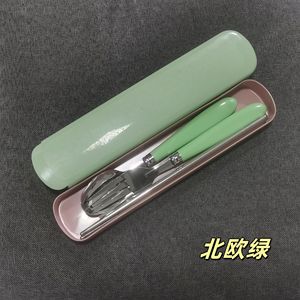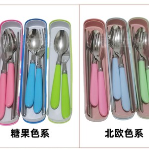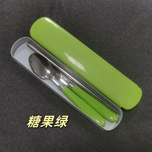 ステンレス製携帯食器、プラスチック製の持ち手付きフォーク、スプーン、箸、家庭用学生・子供用簡易食器3点セット、クロスボーダー