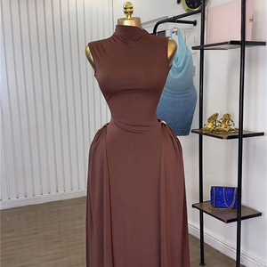 欧美跨境女装2025夏季新款气质半高领高腰无袖中长款棕色连衣裙