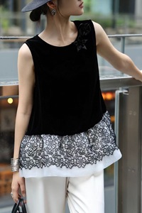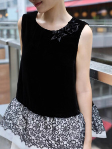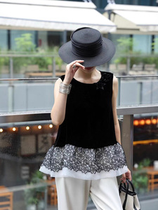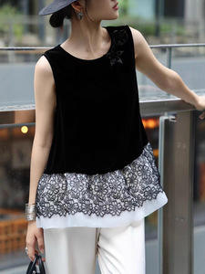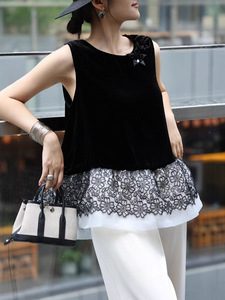 南油批发夏季新款 真丝丝绒领口小花朵拼接 镂空蕾丝花边上衣衬衫