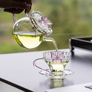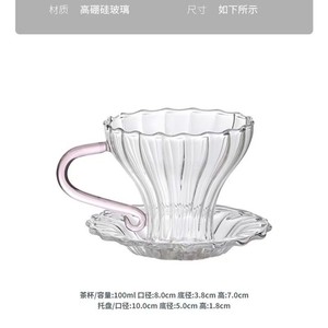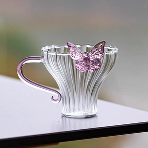 粉色蝴蝶透明玻璃茶杯带把女士品茗杯普洱茶杯带杯垫咖啡杯高颜值