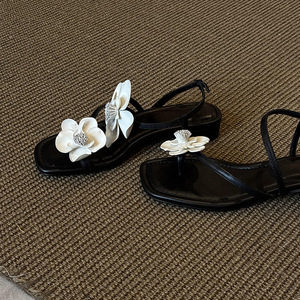 女性用ブラックフラワーワンラインフラットシューズ、ホリデースタイルスクエアトゥオープントゥ多用途ファッションサンダル