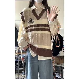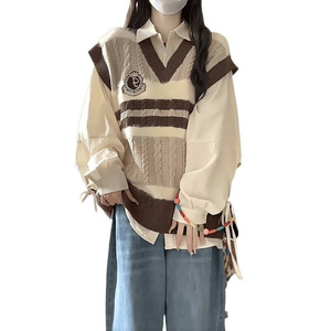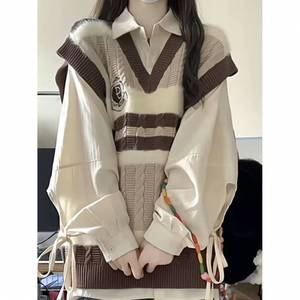 两件套装/春秋季新款日系甜美学院风撞色领针织马甲背心女长衬衫