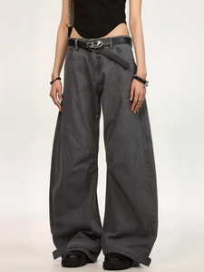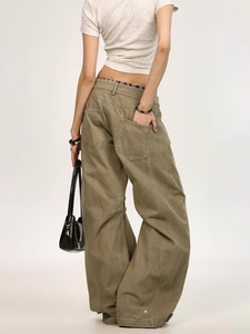 2025春夏新款卡其色复古廓形弯刀褶皱工装牛仔裤男女小众设计长裤
