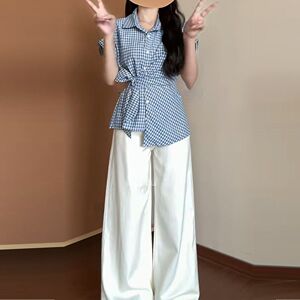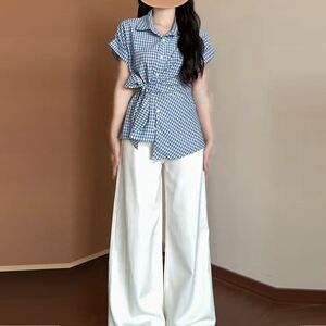 プラスサイズのデザインブルーチェック柄半袖シャツ女性のための夏の太ったmm痩身ストラップピンチウエスト香港スタイルトップ