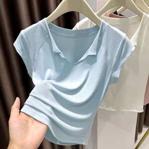 大码莫代尔V领短袖t恤女裝胖mm薄款插肩飞飞袖显瘦内搭面膜t上衣