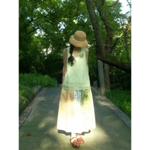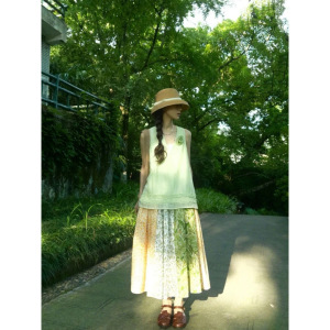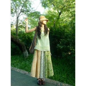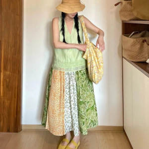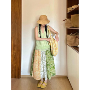 通勤小清新无袖露肩挂脖背心女夏季新款宽松拼接印花半身裙两件套
