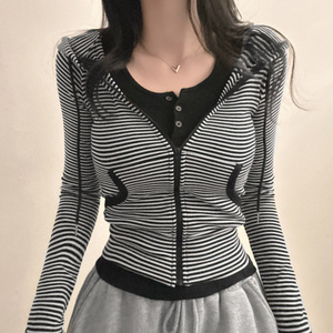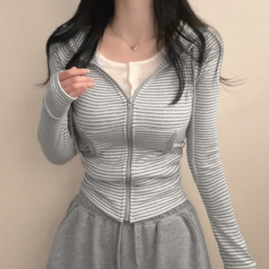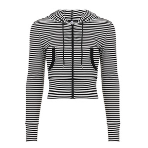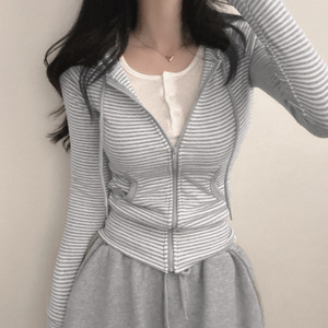 シンプルな韓国風ピュアデュードレッスンストライプウエストフード付きポケットジャケットスポーツカジュアル万能長袖Tシャツトップ