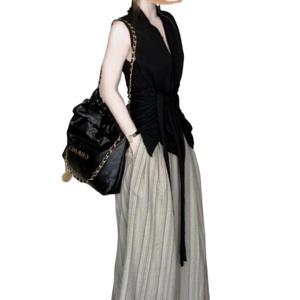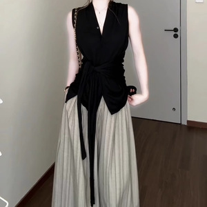 夏日穿搭一整套大码胖mm无袖上衣条纹阔腿裤高级独特巨好看套装女