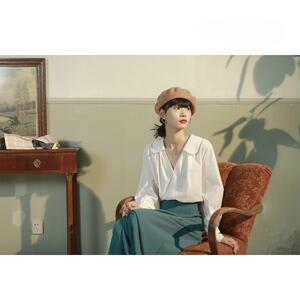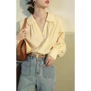 S系法式v领灯笼袖衬衫女2025新款气质娃娃领长袖衬衣