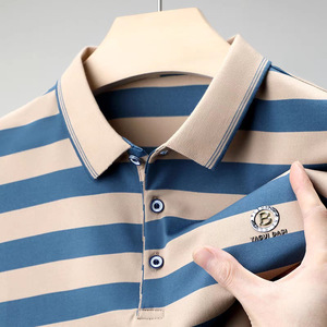 キツツキ綿メンズ半袖Tシャツ2025新作夏中年ルーズラペル半袖ポロシャツストライプ