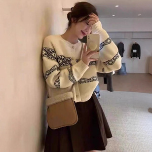韩系复古撞色提花针织开衫女秋冬慵懒风设计感宽松长袖毛衣外套女