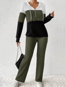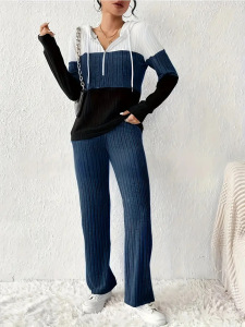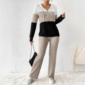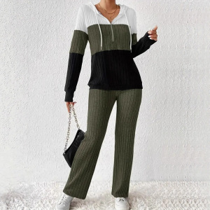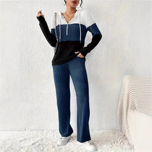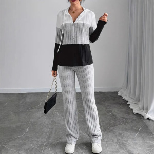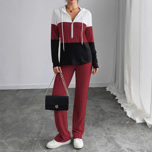 欧美跨境女装25亚马逊撞色拼接拉链连帽长袖上衣长裤休闲两件套装