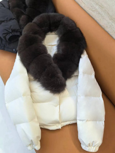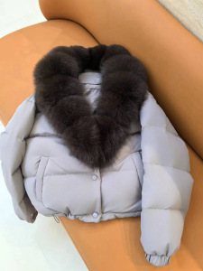在庫ありの女性のフラットダウンジャケット冬の新しい本物のキツネの毛皮の襟グースダウンジャケット女性のショートファッション毛皮のコート