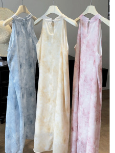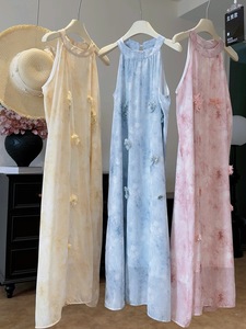 フレンチホルターネックノースリーブドレス女性の立体花花模様バケーションスタイルサスペンダールーズロングスカート夏