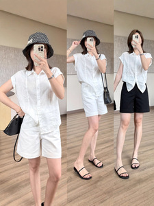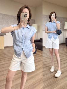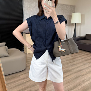 100リネンシャツ【既製品ウォッシュ】柔らかくて涼しいオールドマネースタイル中空カール半袖トップス G070807