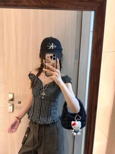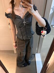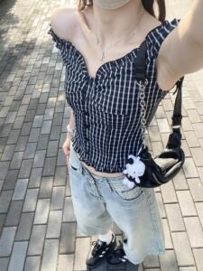 レトロホットガール黒チェック柄ワンショルダーツーウェアシャツレディース夏ウエストリトルオフショルダーショートトップ