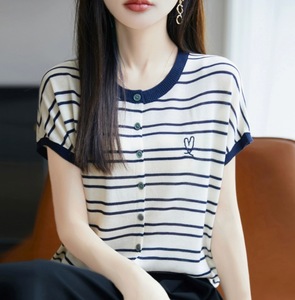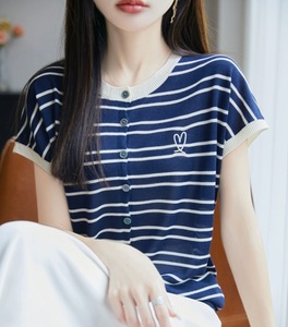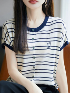 女性用夏ニット半袖Tシャツ、韓国風ラウンドネック、コントラストストライプ、愛の刺繍トップス、ゆったりとした半袖ボトムシャツ