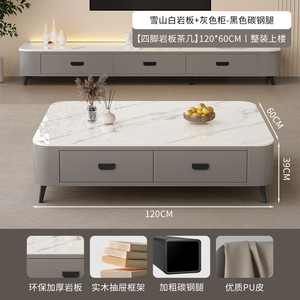 【四脚岩板茶几】雪山白岩板+灰色柜-黑色碳钢腿120*60丨整装上楼