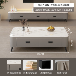 【四脚岩板茶几】雪山白岩板+灰色柜-黑色碳钢腿100*50丨整装上楼
