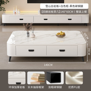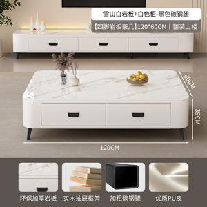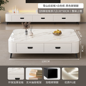 【四脚岩板茶几】雪山白岩板+白色柜-黑色碳钢腿140*60丨整装上楼