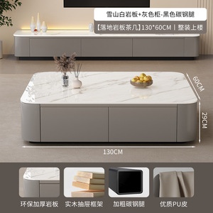 【落地岩板茶几】雪山白岩板+灰色柜-黑色碳钢腿130*60丨整装上楼