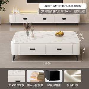 【四脚岩板茶几】雪山白岩板+白色柜-黑色碳钢腿100*50丨整装上楼