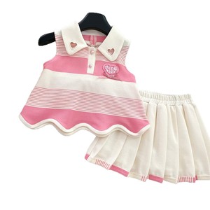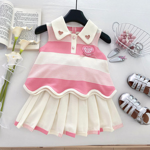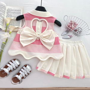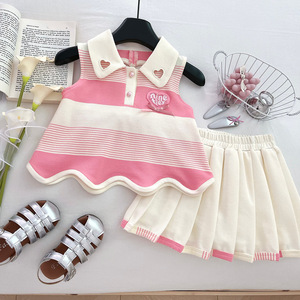 2025 新しい夏の女の子の甘くてかわいいスーツ西洋スタイルストライプラブトッププリーツスカートツーピースセットドロップシッピング