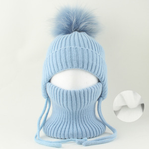 跨境新款真狐狸毛球针织护耳帽子围脖套装加绒保暖条纹帽男女童
