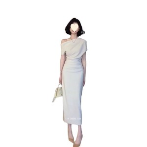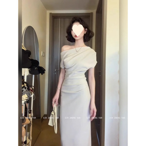 现货XZY/欣争艳微胖御姐气质斜肩荡领连衣裙女25年夏褶皱收腰长裙