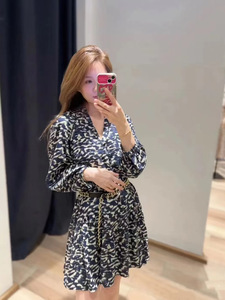 法式BA24年秋冬新款迷你裙梦幻豹纹七分袖宽松显瘦圆领短款连衣裙