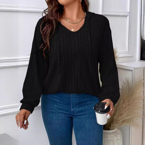 2025 アマゾン秋冬新無地大きいサイズレディーストップス V ネックフード付き長袖ピットストリップ起毛 T シャツルーズ