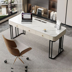 【单桌无排插+三抽柜】雪山白*白柜*金架