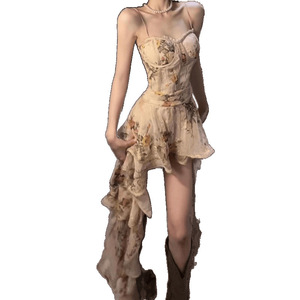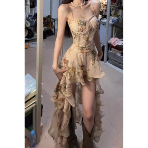 uj 新しいスタイルの花柄サスペンダードレス女性の夏の新しいデザイン不規則なウエスト痩身ロングスカート