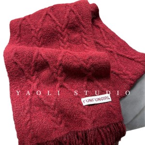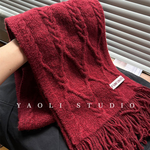 安可拉红羊毛混纺针织流苏围巾女秋冬保暖防寒毛线围脖
