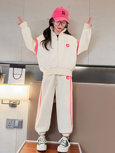 女の子のゆったりとしたカジュアルなスタンドアップカラースウェットシャツスーツ、大きな子供用刺繍ジッパーカーディガンレギンススウェットパンツ女の子2点セット
