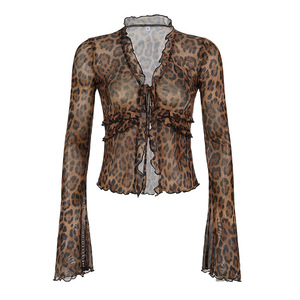 美式复古豹纹网纱系带喇叭袖衬衫女木耳边薄款微透修身罩衫上衣